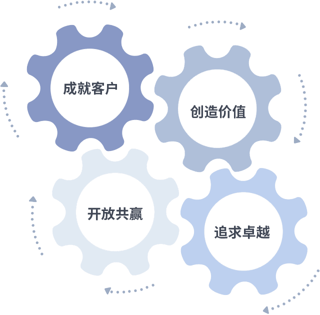 成就客户是一切决策的出发点,,创造价值是衡量所有工作的标准,,,,追求卓越是我们做事做人的态度,,,开放共赢是我们的格局也是最终的结果。。。价值观的齿轮环环相扣,,推动着组织里的每个人不断向前。。